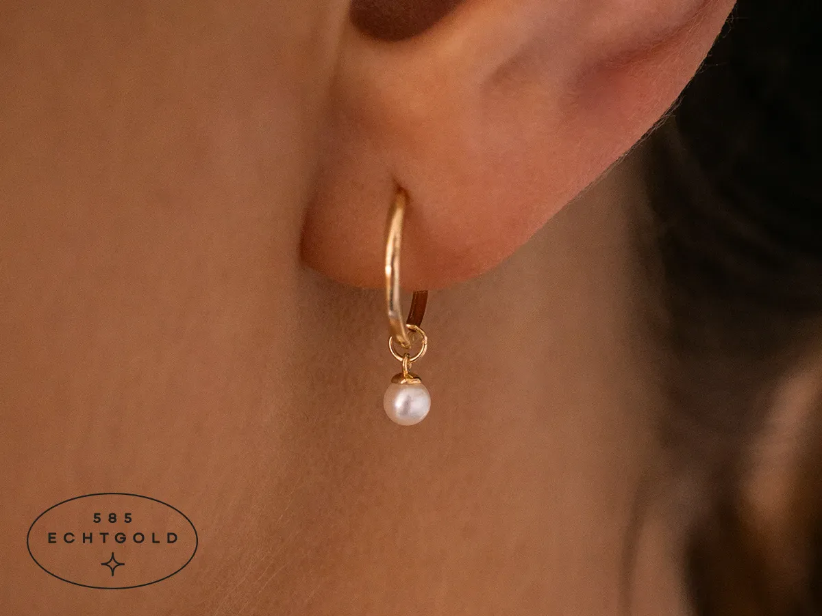 Die Creolen Nios werden aus 585 Gelbgold gefertigt. Mit ihren 12mm Durchmesser sind sie kleine, schlichte Ohrringe für den Alltag. Das besondere an den Echtgold Creolen: Die kleine Süßwasserperle ist mit ihrer Größe von 2mm ein kleines, feines Add-On, das man nach Lust und Laune auch gern weglassen kann. Falls man es mal nicht so verspielt oder besonders schlicht braucht.