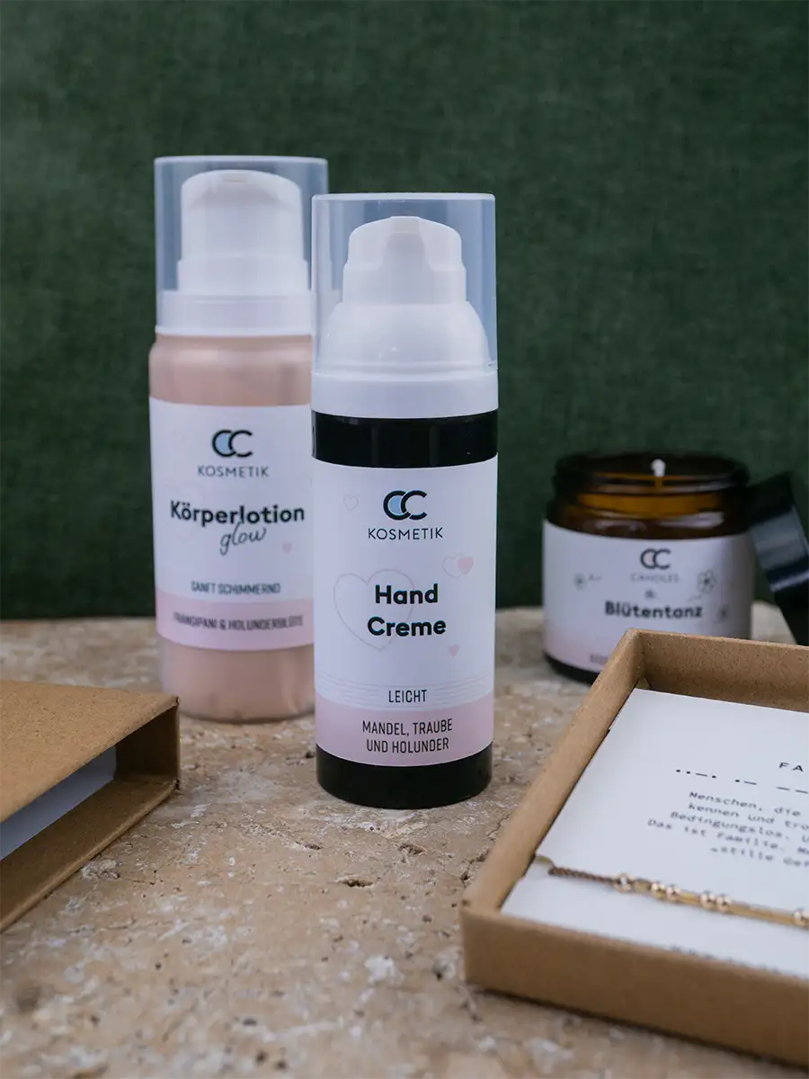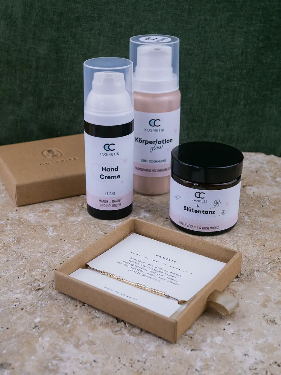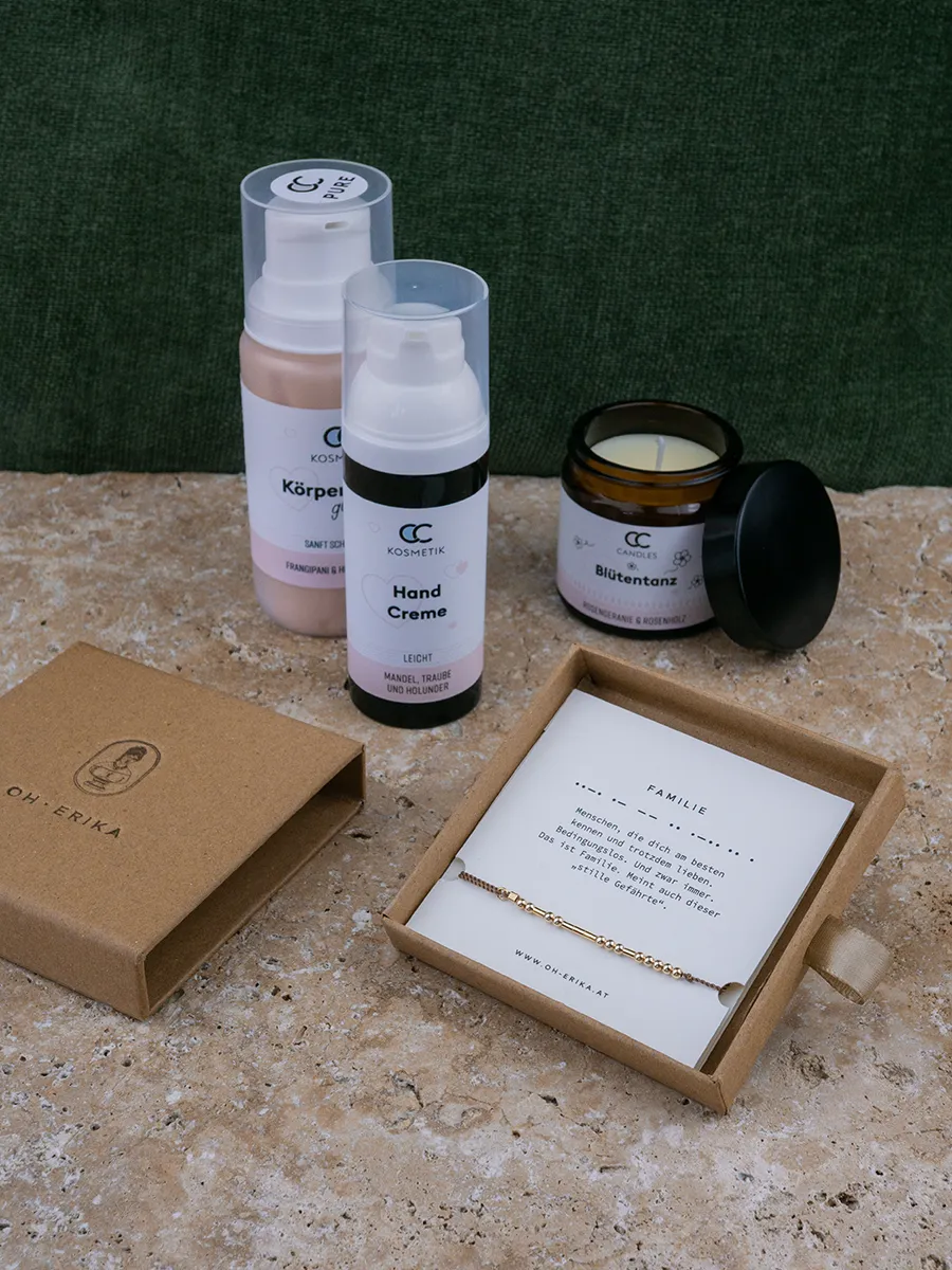 Ein Geschenk-Set, das von Herzen kommt und alle Sinne berührt – unser liebevoll zusammengestelltes Set vereint Pflege, Wärme und eine persönliche Botschaft.