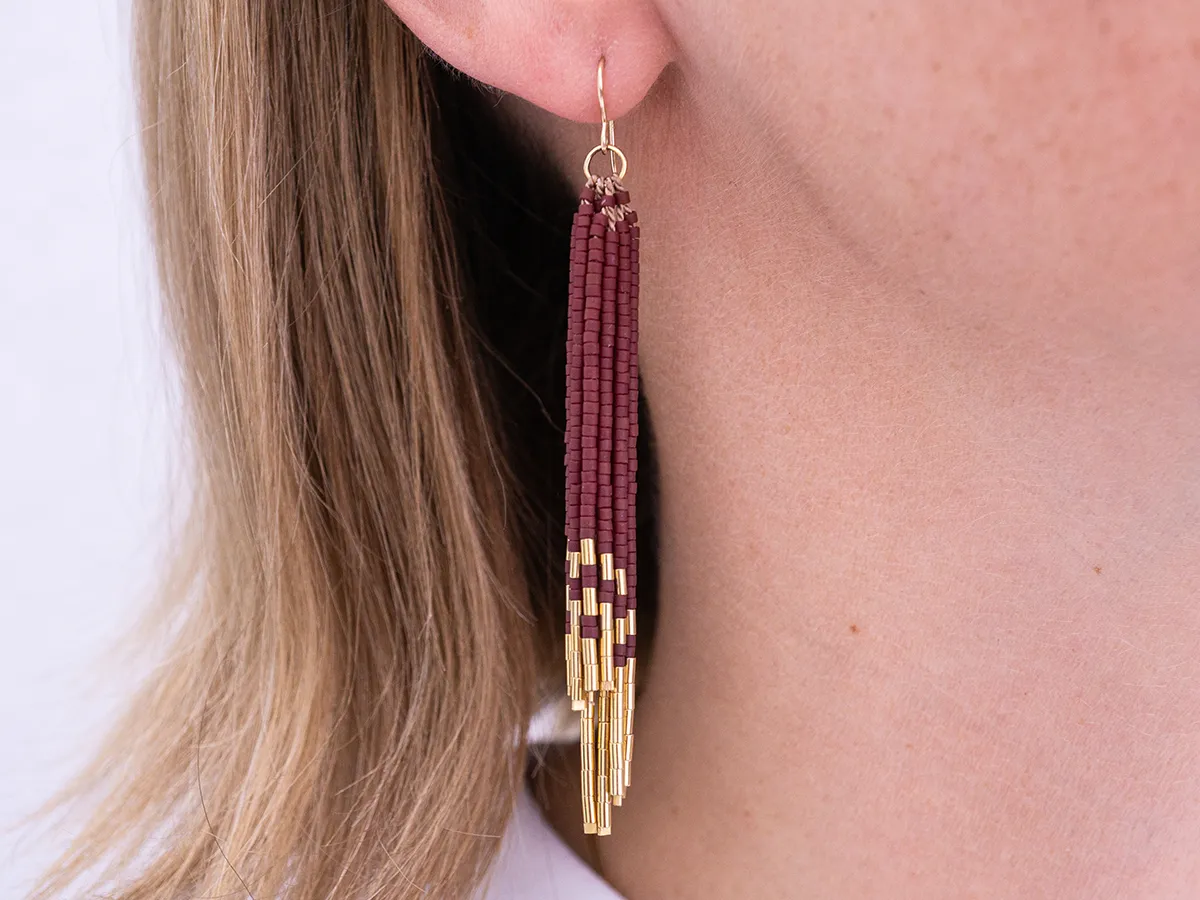 Diese Wasserfall Ohrringe bestehen aus Glasperlen in einem dunklen Braunton sowie zylinderförmigen Perlen in 14 Karat Gold gefüllt – für uns einfach die absoluten Herbstfarben. Trotz ihrer Länge von ca. 10cm sind die Ohrringe absolute Leichtgewichte. Die Ohrringe können auf Wunsch auch mit Perlen in 925 Sterling Silber gefertigt werden.